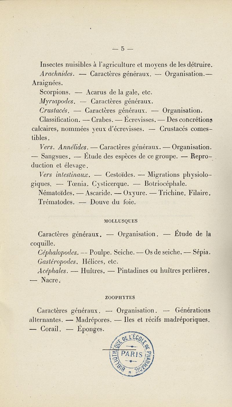Programme du cours de Zoologie