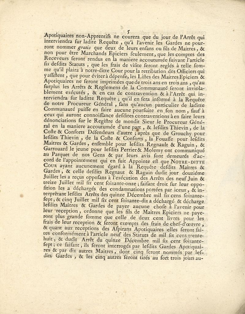 Arrêt de la Cour du Parlement en forme de règlement pour le corps des maîtres apothicaires de Paris