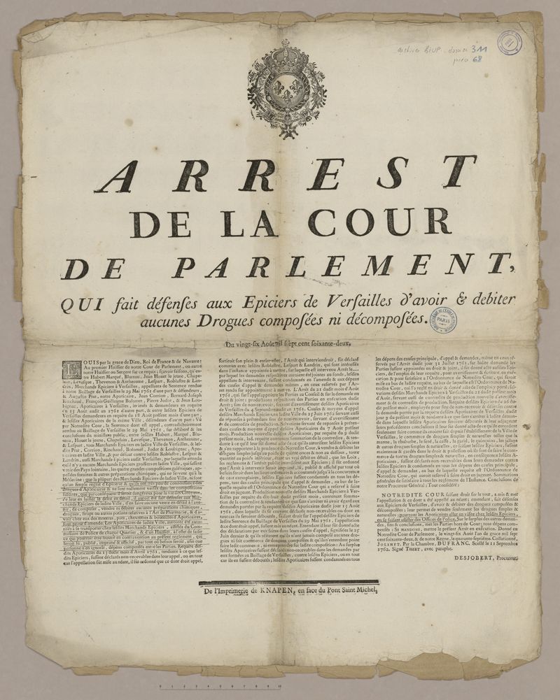Arrêt de la Cour de Parlement qui fait défenses aux épiciers de Versailles d'avoir et de débiter aucunes drogues composées ni décomposées