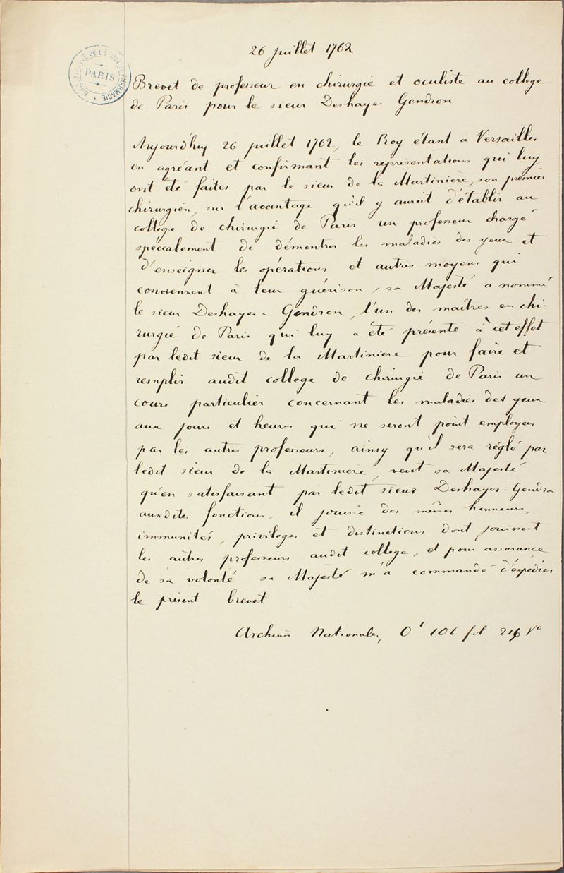Copie d'un brevet de professeur en chirurgie et occuliste au Collège de Paris, accordé au sieur Deshayes-Gendron (26 juil. 1762)
