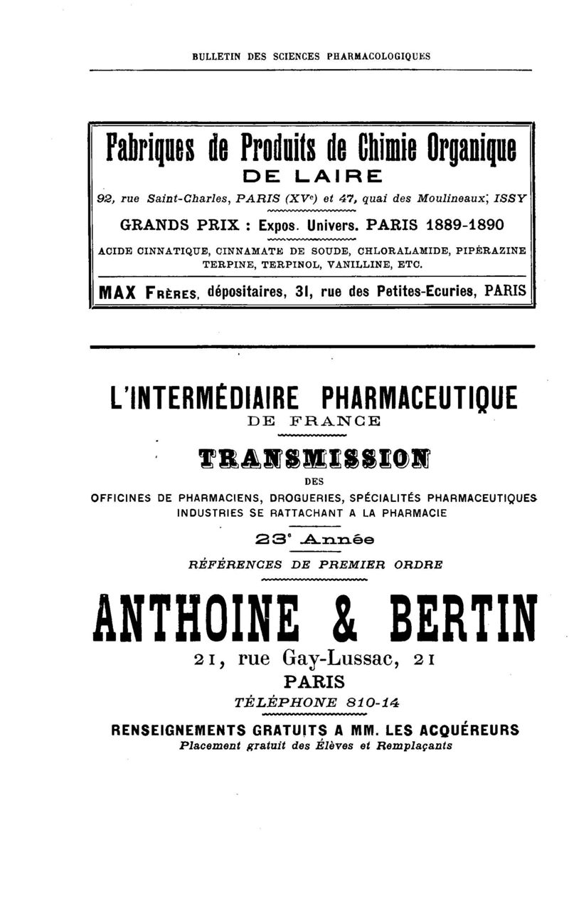 Bulletin des sciences pharmacologiques : organe scientifique et professionnel [Annexes : partie professionnelle et commerciale]
