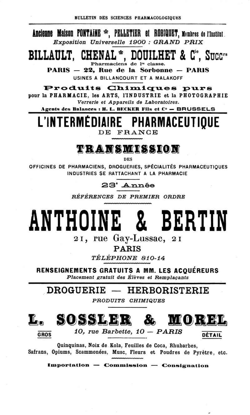 Bulletin des sciences pharmacologiques : organe scientifique et professionnel [Annexes : partie professionnelle et commerciale]