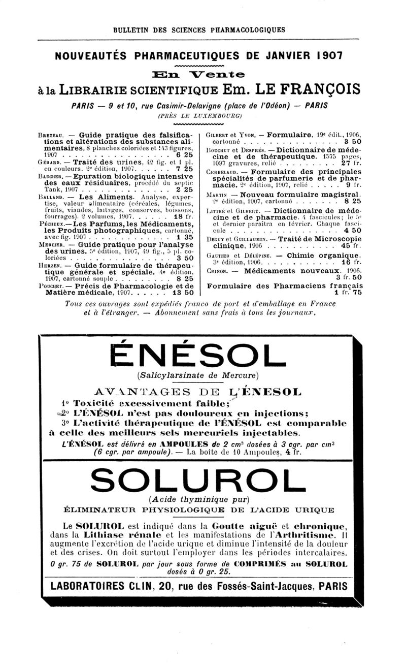 Bulletin des sciences pharmacologiques : organe scientifique et professionnel [Annexes : partie professionnelle et commerciale]