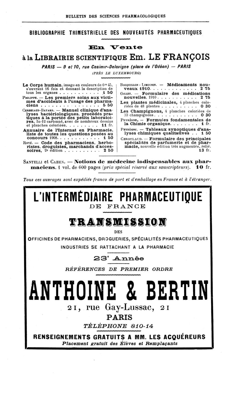 Bulletin des sciences pharmacologiques : organe scientifique et professionnel [Annexes : partie professionnelle et commerciale]