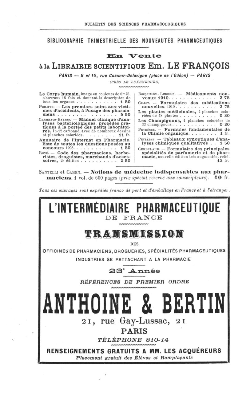 Bulletin des sciences pharmacologiques : organe scientifique et professionnel [Annexes : partie professionnelle et commerciale]