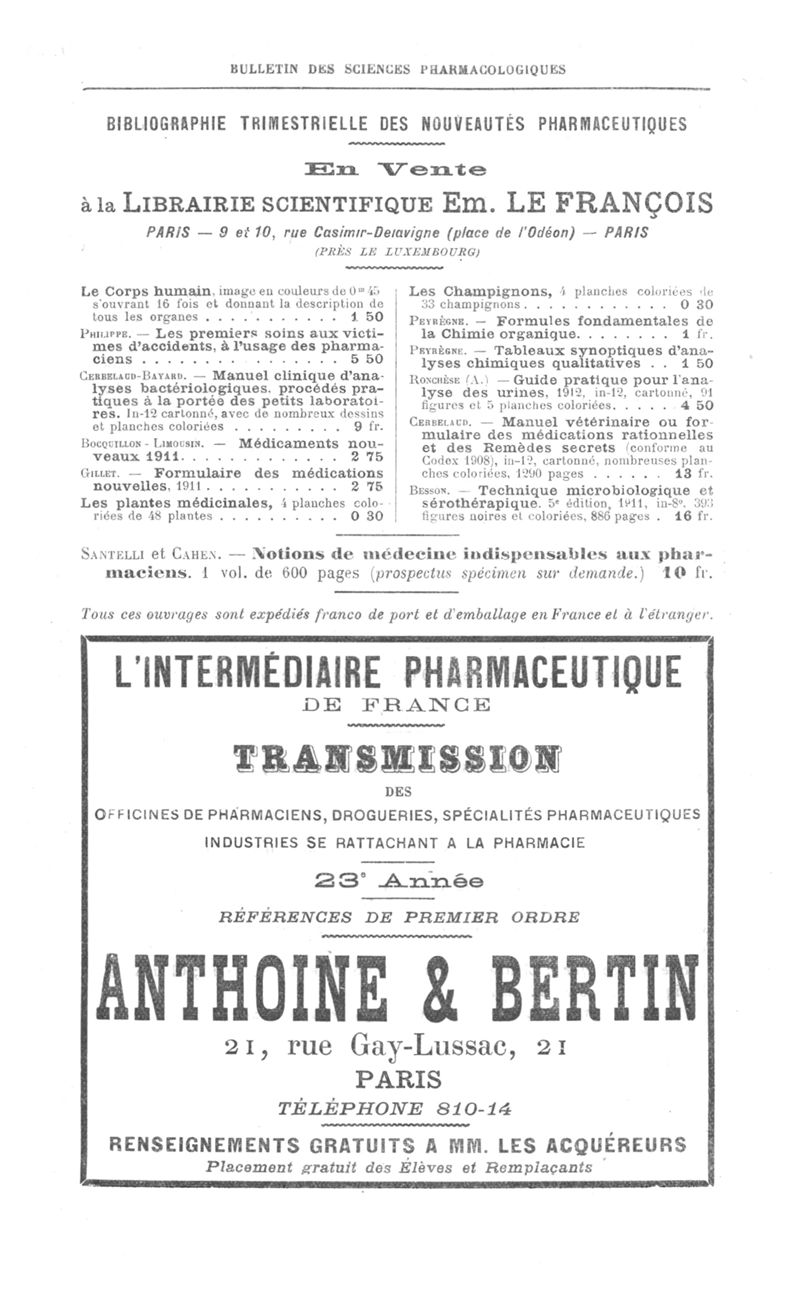 Bulletin des sciences pharmacologiques : organe scientifique et professionnel [Annexes : partie professionnelle et commerciale]