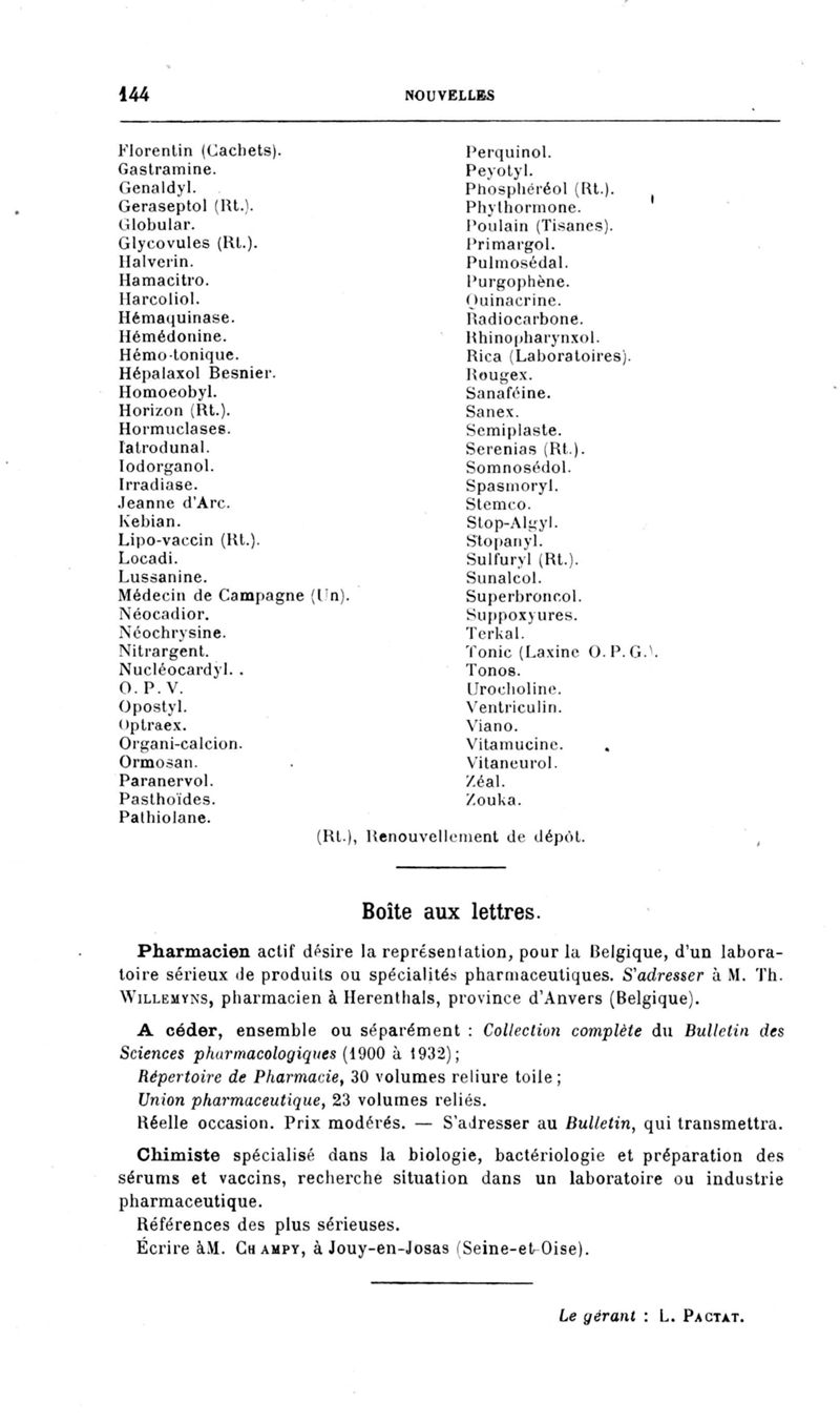 Bulletin des sciences pharmacologiques : organe scientifique et professionnel [Bulletin des intérêts professionnels]