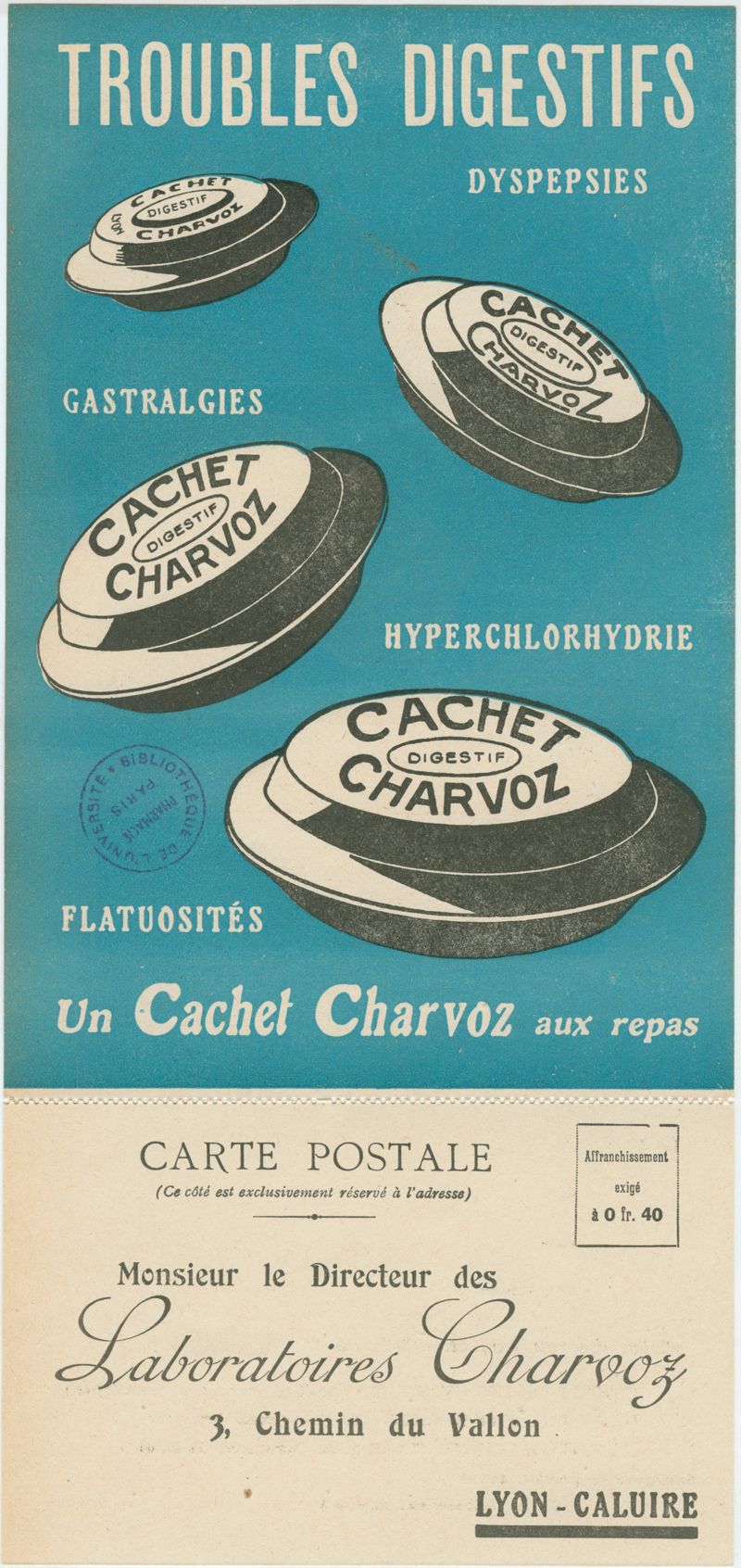 [Cachet digestif et Hépatogènes Charvoz. Publicité insérée dans le journal : "Les Archives de la Société des sciences médicales et biologiques de Montpellier" : numéros de janvier (mars) 1928 ; février (avril) 1928.]
