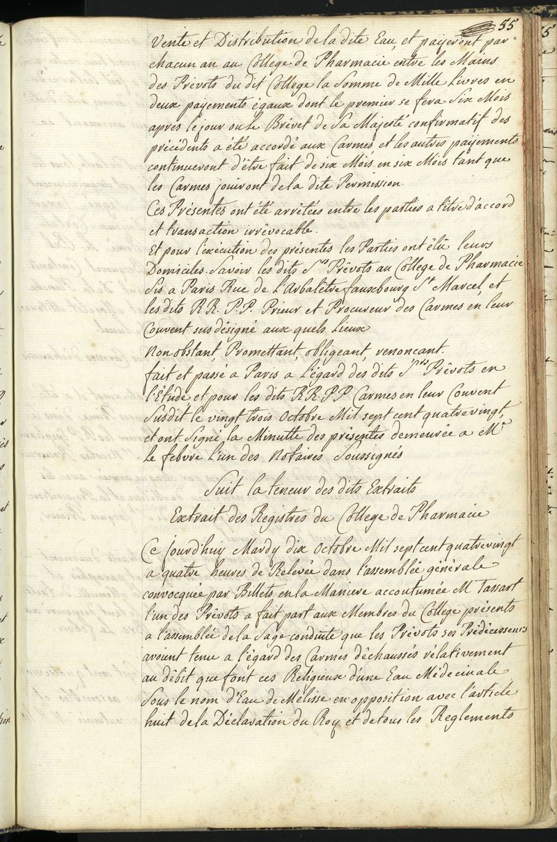 Livre des délibérations, 1777-1797 : statuts et pièces concernant la Pharmacie ; règlement du Collège de Pharmacie, ouverture du Collège et délibérations du Collège et de la Société libre des Pharmaciens de Paris, du 11 juillet 1777 au 26 octobre 1797.