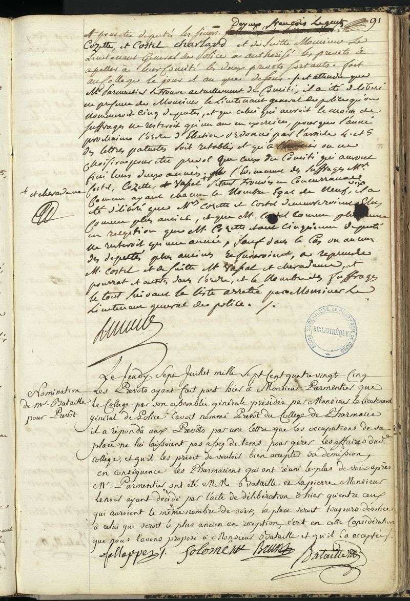 Livre des délibérations, 1777-1797 : statuts et pièces concernant la Pharmacie ; règlement du Collège de Pharmacie, ouverture du Collège et délibérations du Collège et de la Société libre des Pharmaciens de Paris, du 11 juillet 1777 au 26 octobre 1797.