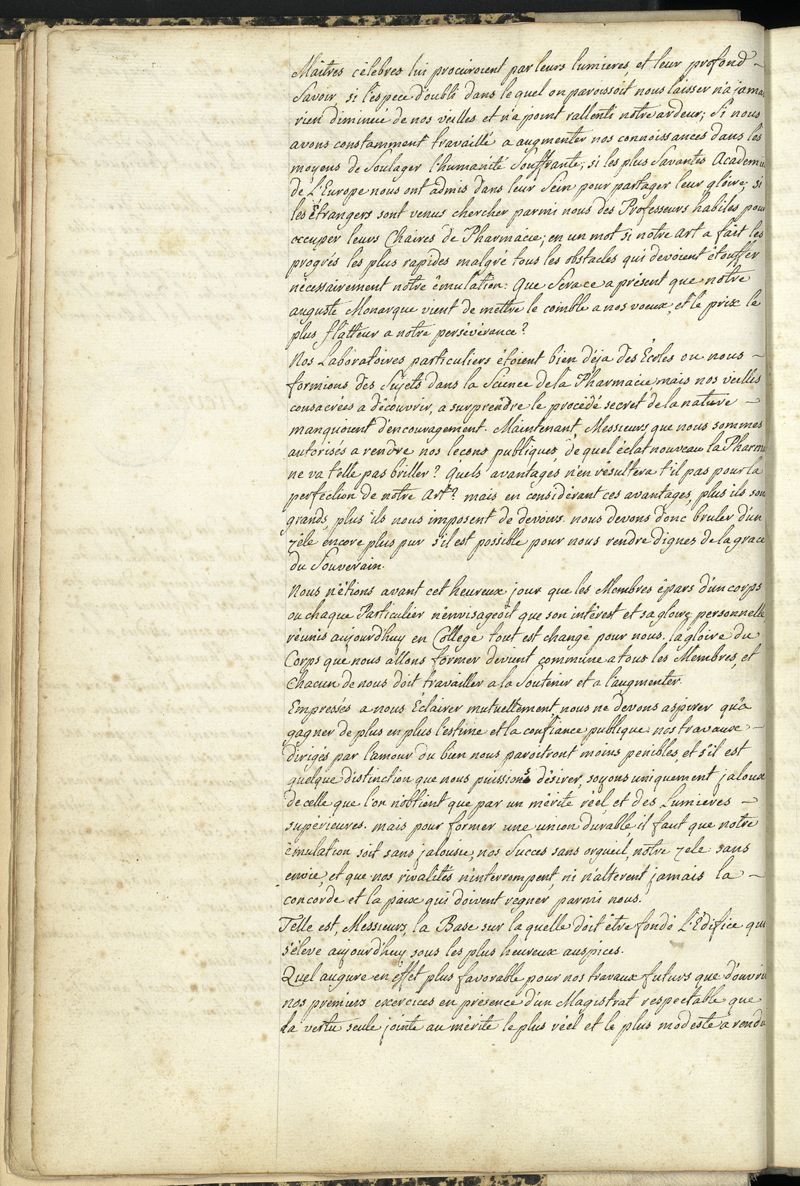 Livre des délibérations, 1777-1797 : statuts et pièces concernant la Pharmacie ; règlement du Collège de Pharmacie, ouverture du Collège et délibérations du Collège et de la Société libre des Pharmaciens de Paris, du 11 juillet 1777 au 26 octobre 1797.