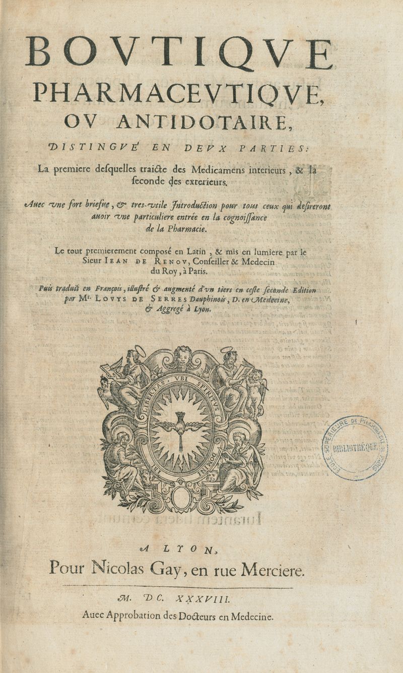Les oeuvres pharmaceutiques du Sr Jean de Renou, conseiller & medecin du roy à Paris : augmentées d'un tiers en cette seconde edition par l'auteur : puis traduittes, embellies de plusieurs figures necessaires à la cognoissance de la medecine & pharmacie, & mises en lumière par M. Louys de Serres dauphinois, docteur en medecine, & aggregé à Lyon. [Suivi de :] Boutique pharmaceutique, ou Antidotaire, distingué en deux parties : la premiere desquelles traicte des medicamens interieurs, & la seconde des exterieurs. Avec une fort briefve, & tres-utile introduction pour tous ceux qui desireront avoir une particuliere entrée en la cognoissance de la pharmacie. Le tout premierement composé en latin, & mis en lumiere par le sieur Jean de Renou, conseiller & medecin du Roy, à Paris. Puis traduit en françois, illustré & augmenté d'un tiers en ceste seconde edition par Mr. Louys de Serres Dauphinois, D. en medecine, & aggregé à Lyon.