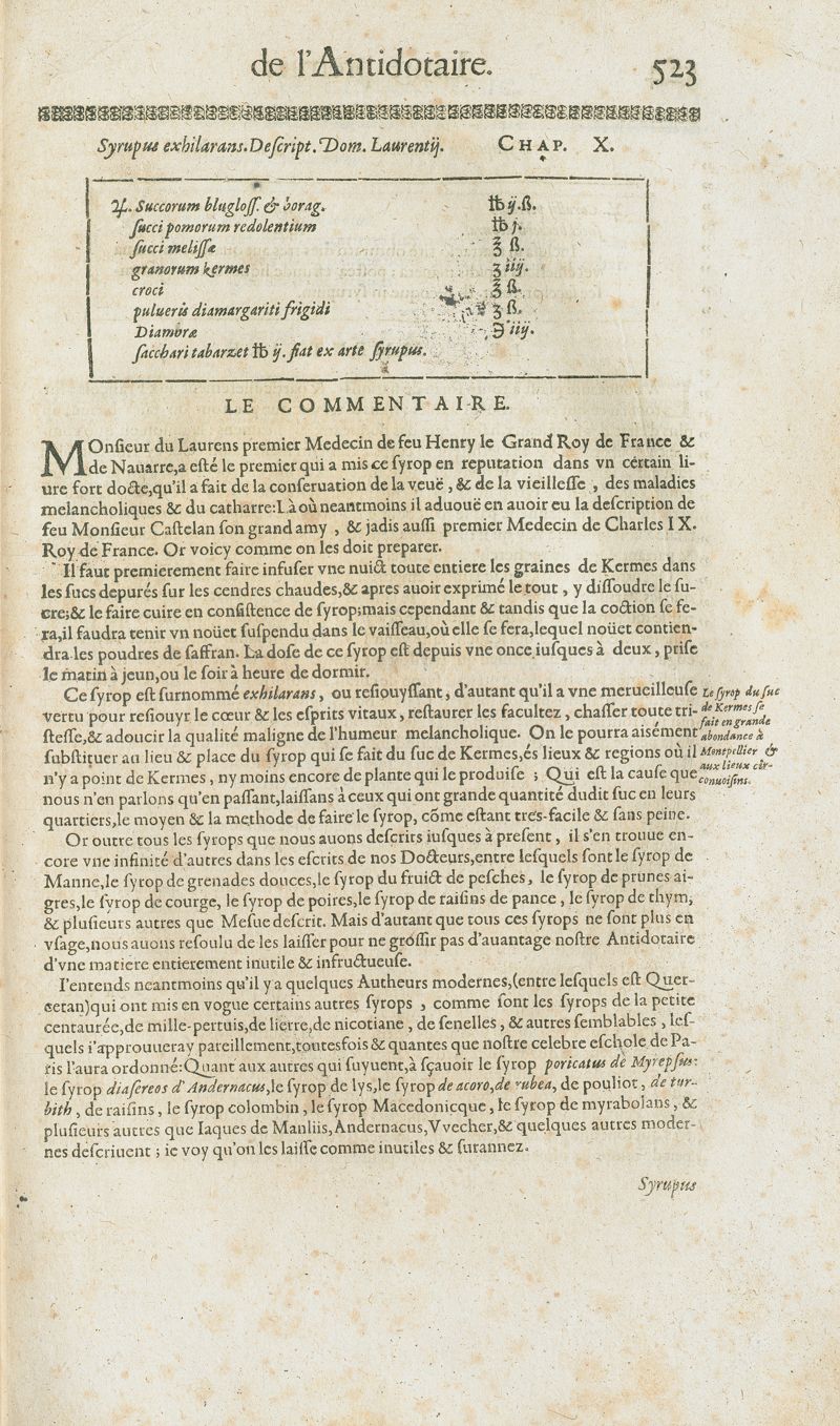 Les oeuvres pharmaceutiques du Sr Jean de Renou, conseiller & medecin du roy à Paris : augmentées d'un tiers en cette seconde edition par l'auteur : puis traduittes, embellies de plusieurs figures necessaires à la cognoissance de la medecine & pharmacie, & mises en lumière par M. Louys de Serres dauphinois, docteur en medecine, & aggregé à Lyon. [Suivi de :] Boutique pharmaceutique, ou Antidotaire, distingué en deux parties : la premiere desquelles traicte des medicamens interieurs, & la seconde des exterieurs. Avec une fort briefve, & tres-utile introduction pour tous ceux qui desireront avoir une particuliere entrée en la cognoissance de la pharmacie. Le tout premierement composé en latin, & mis en lumiere par le sieur Jean de Renou, conseiller & medecin du Roy, à Paris. Puis traduit en françois, illustré & augmenté d'un tiers en ceste seconde edition par Mr. Louys de Serres Dauphinois, D. en medecine, & aggregé à Lyon.