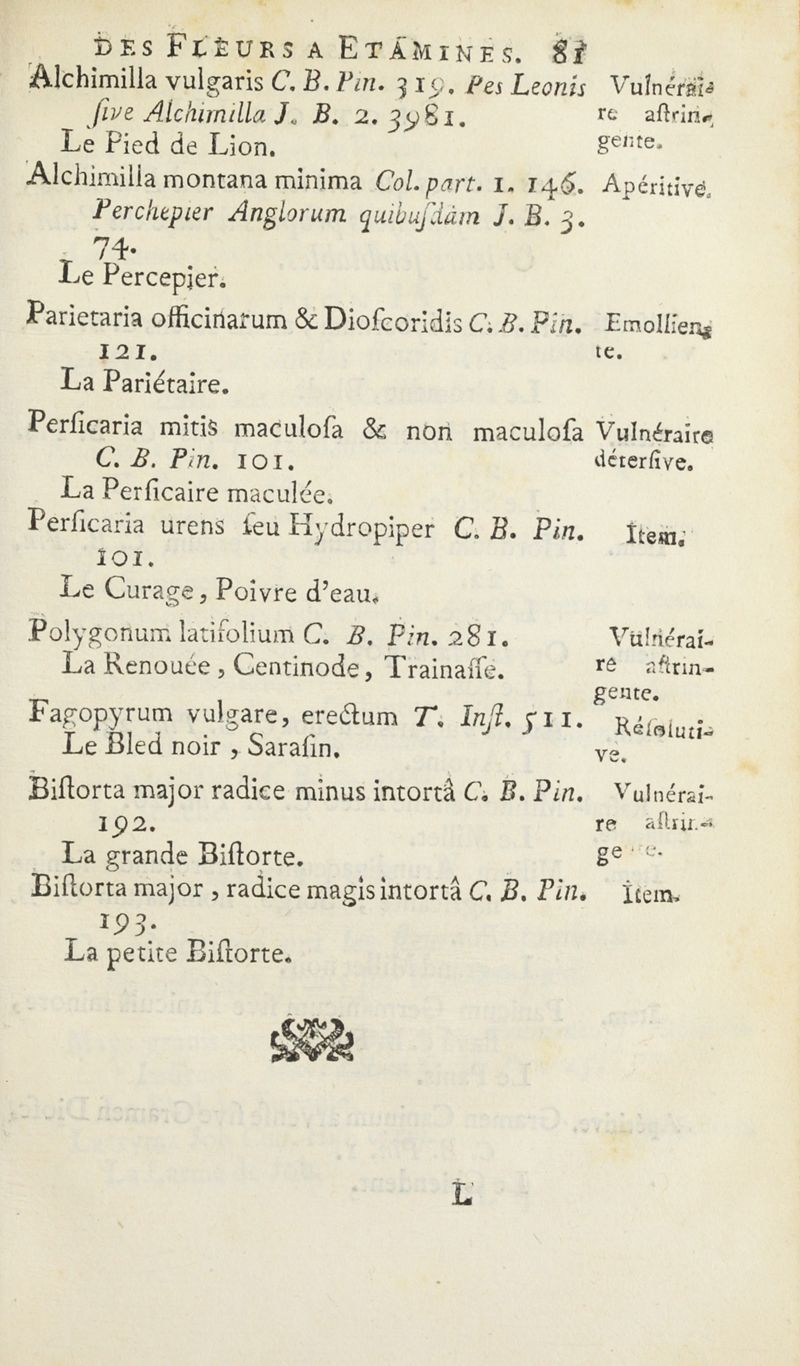 Catalogue des Plantes du Jardin de M.rs les Apoticaires de Paris, suivant leurs genres et les caractères des fleurs, conformément à la méthode de Monsieur Tournefort dans ses Instituts.