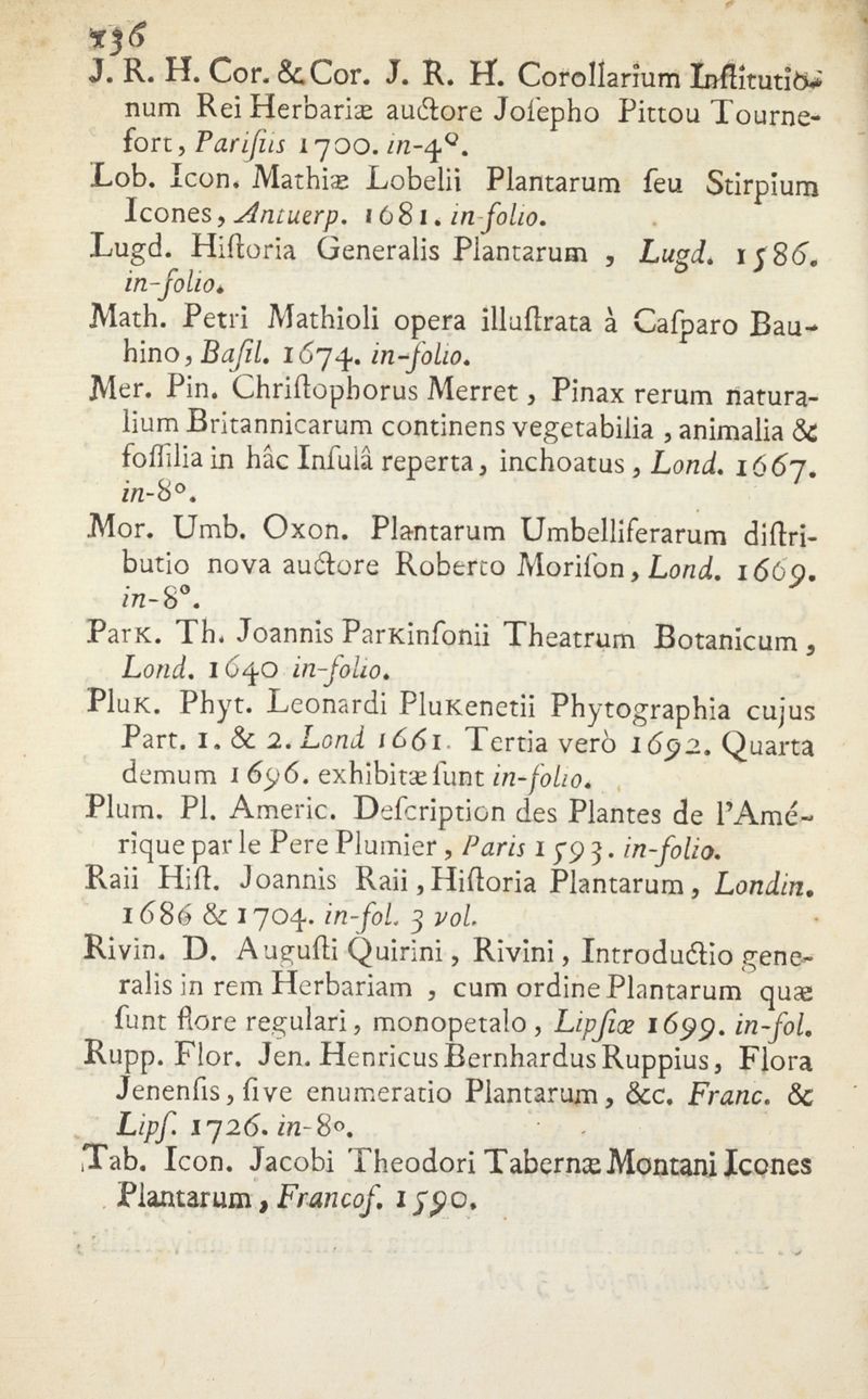 Catalogue des Plantes du Jardin de M.rs les Apoticaires de Paris, suivant leurs genres et les caractères des fleurs, conformément à la méthode de Monsieur Tournefort dans ses Instituts.
