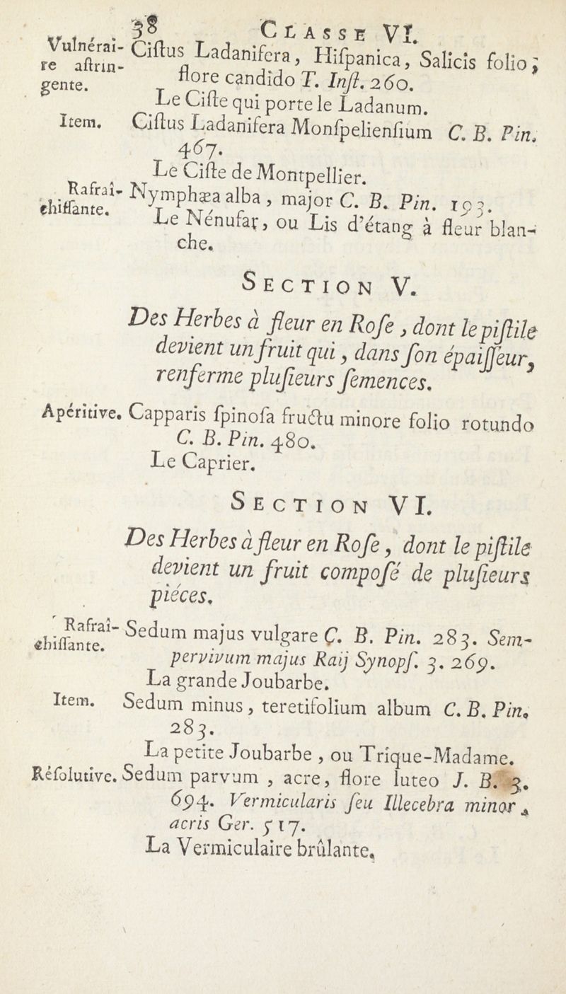 Catalogue des Plantes du Jardin de M.rs les Apoticaires de Paris, suivant leurs genres et les caractères des fleurs, conformément à la méthode de Monsieur Tournefort dans ses Instituts.