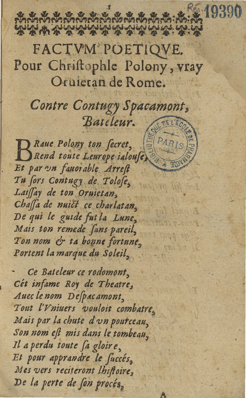 Factum poetique. Pour Christophle Polony, vray Oruietan de Rome. Contre Contugy Spacamont, Bateleur.