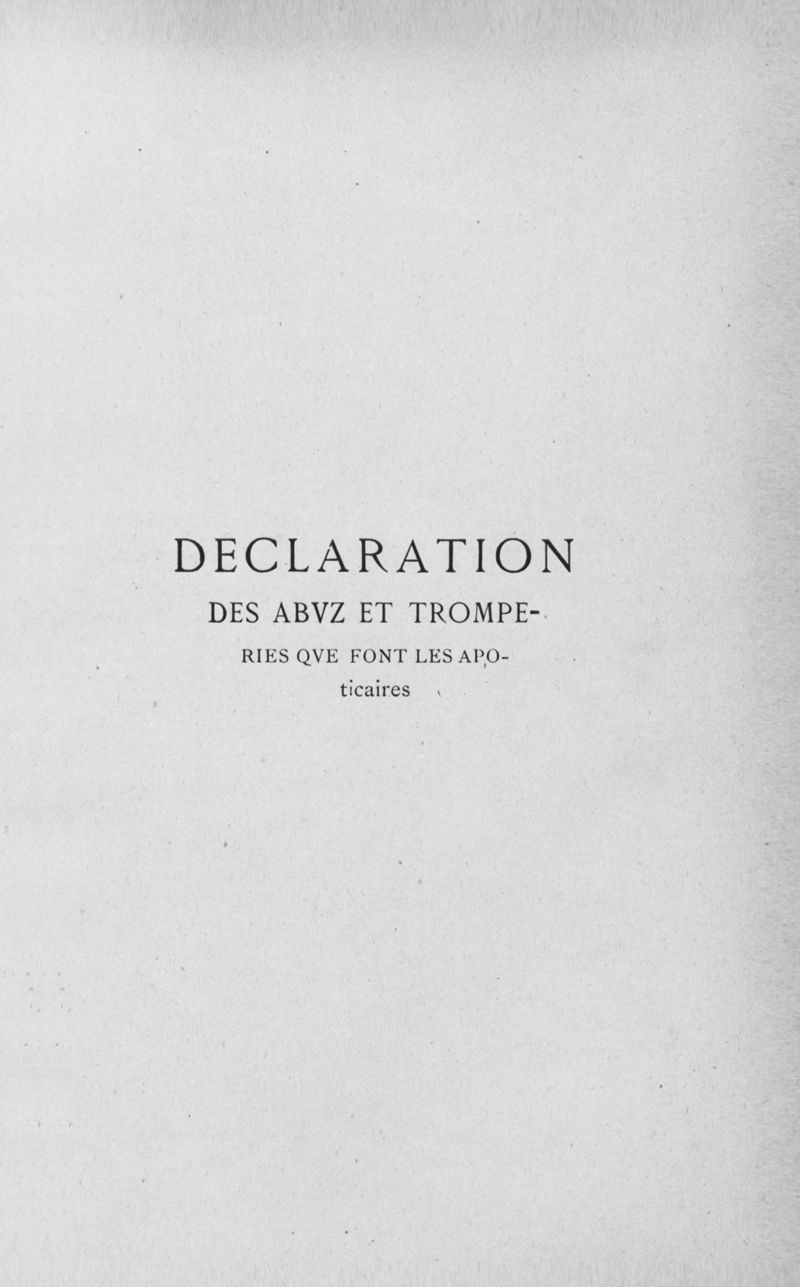 Déclaration des abuz et tromperies que font les apoticaires, fort utile et nécessaire à ung chacun studieux et curieux de sa santé composée par maistre Lisset Benancio (Sébastien Colin)