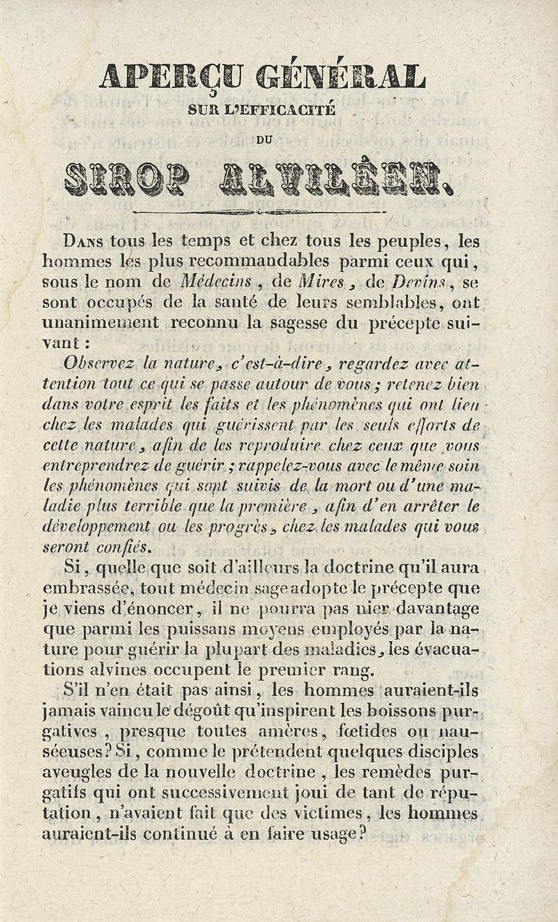 Aperçu général sur l'efficacité du Sirop Alviléen composé par Burq jeune, pharmacien, rue Saint-Lazare, no. 4, Chaussée d'Antin, près du Faubourg Montmartre