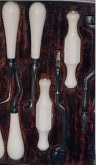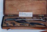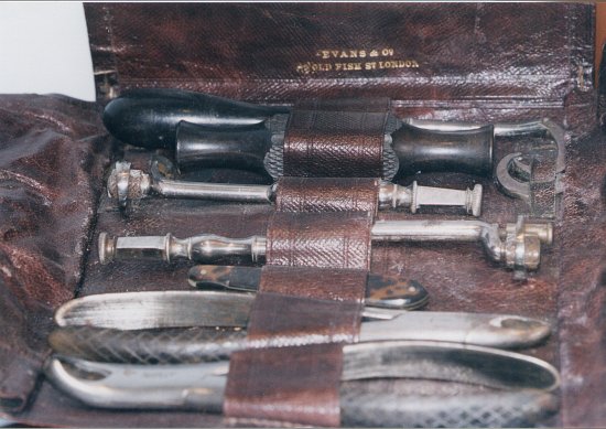 Trousse à extraction composée de deux daviers, un bistouri pliable (marqué Ferguson), un élévateur, un manche de clef de Garengeot avec un fut droit, un fut double courbure. Marqué sur le cuir : Evans & Co. Londres c.1853 |