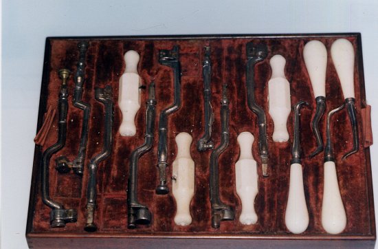 Magnifique coffret pour extractions, en acajou décoré et renforcé de laiton. Il est composé de trois plateaux garnis de velours avec vingt quatre daviers (cinq manquent), huit clefs avec leurs quatre manches ivoire, et quatre élévateurs aussi à manches ivoire. |