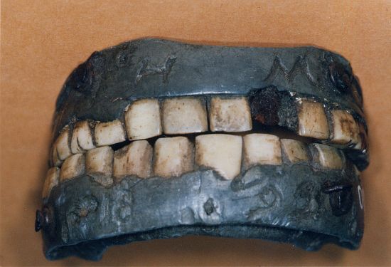 Belle prothèse à base et groupes molaires sculptés en ivoire d'hippopotame. Dents antérieures en céramique rivetées sur une gencive colorée à l'éosine |