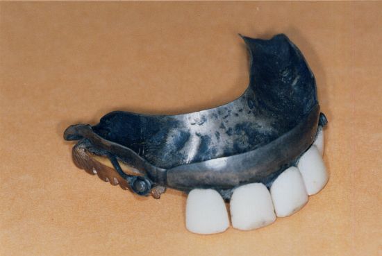 prothèse supérieure, base métal, dents antérieures céramique à glissières, blocs postérieurs en ivoire sculpté. Verrous d'ancrage pour ressorts de sustentation. 19ème |