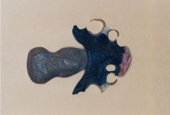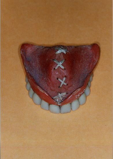 prothèse en vulcanite avec obturateur pour communication palatine. Crochets or, dents en vulcanite blanche, gencive en vulcanite rose. La base de la prothèse et l'obturateur sont aussi en vulcanite. Quatre sortes de vulcanite sur une même prothèse ! La technique de la vulcanite était bien dominée, elle fut utilisée durant une centaine d'année. |