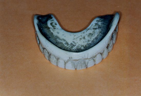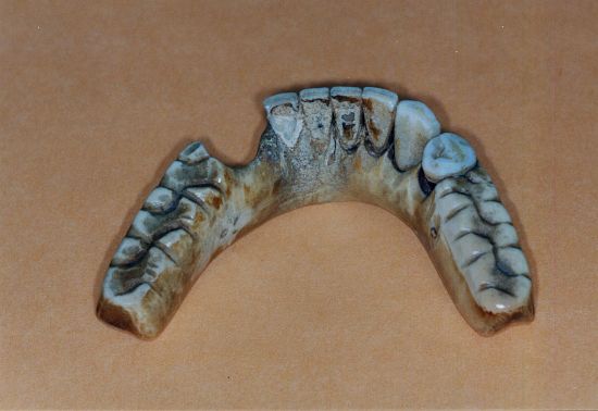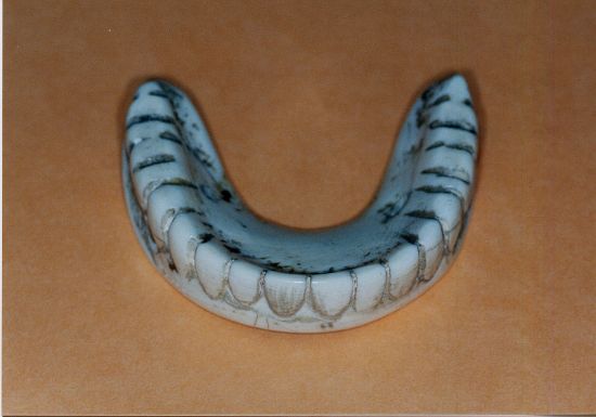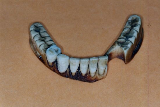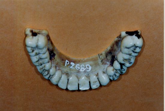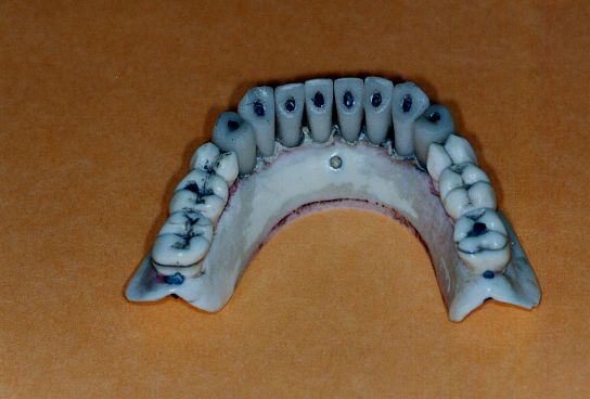 Complet inférieur base ivoire avec dents antérieures naturelles rapportées. Perforations pour systèmes d'ancrage des ressorts de stabilisation. |