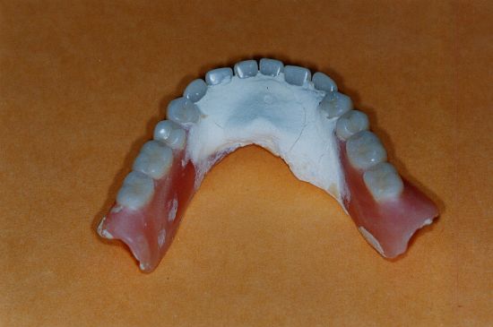 Beau travail prothétique avec dents céramique ajustées sur plaque estampée |