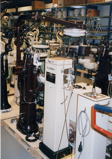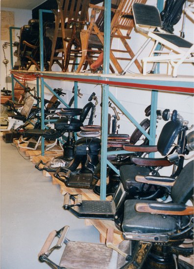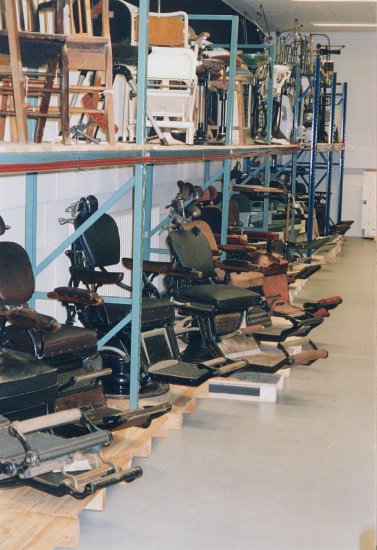 Nous avons pu apprécier lors de ces visites avec quels soins et dans quelles conditions sont conservés tous les objets de la collection dentaire. Si cela peut sembler relativement facile pour des petites pièces, cela pose d'autres problèmes pour les fauteuils, équipements et meubles dentaires. Là encore nous avons constaté le même soin de rangement et de stockage, point stratègique de la conservation d'un patrimoine.