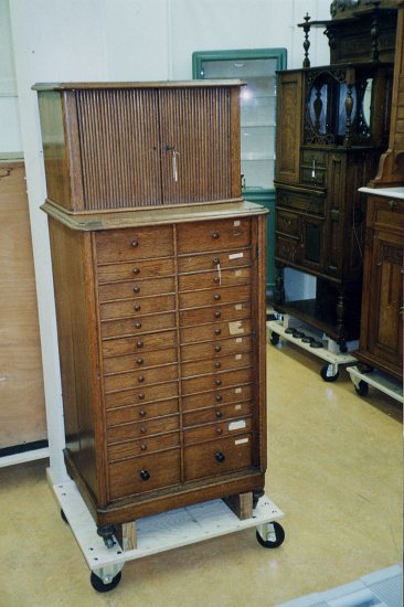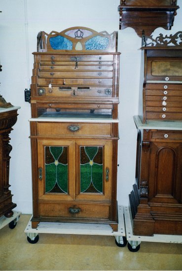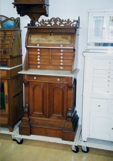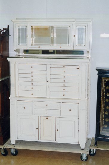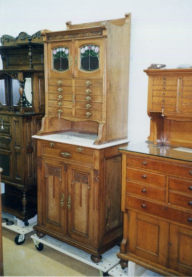 Un grand classique : Meuble de cabinet avec porte-fraise, équipement de prothèse pour retouches intégrés. Le n°7 de chez Ash, Londres c.1910 |