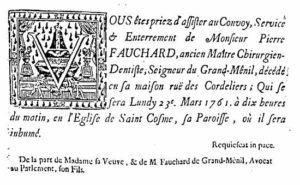 Pierre FAUCHARD décède le 21 mars 1761 à PARIS, rue des cordeliers, d’après l’extrait de la paroisse Saint- Côme et Saint-Damien à Paris.: « le 21 mars 1761 a été inhumé , nef du Saint Sacrement, le corps de sieur Pierre FAUCHARD, ancien maître chirurgien-dentiste, seigneur de GRAND-MESNIL, veuf en seconde noce d’Élisabeth CHEMIN et époux de Louise ROUSSELOT, décédé avant-hier, âgé de 83 ans, rue des Cordeliers de cette paroisse… ».