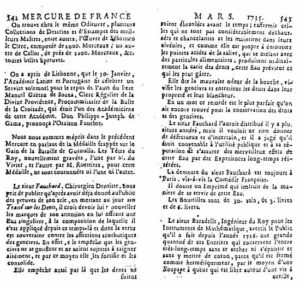 - Nous avons pu constater que presque tous les praticiens, quelque soit leur formation, vendent des remèdes, et cela a une grande importance économique. Or Pierre FAUCHARD fait comme beaucoup d’autres, il passe une annonce dans le MERCURE DE FRANCE en Mars 1735, et il vend une « eau singulièreÂ….dont la vertu est souveraine contre les affections scorbutiques des gencives ». La diffusion des journaux étant assez tardive au 18ème siècle (6) , nous avons beaucoup moins d’informations sur le début du 18ème siècle que sur la fin.