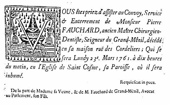 Pierre FAUCHARD décède le 21 mars 1761 à PARIS, rue des cordeliers, d’après l’extrait de la paroisse Saint- Côme et Saint-Damien à Paris.: « le 21 mars 1761 a été inhumé , nef du Saint Sacrement, le corps de sieur Pierre FAUCHARD, ancien maître chirurgien-dentiste, seigneur de GRAND-MESNIL, veuf en seconde noce d’Élisabeth CHEMIN et époux de Louise ROUSSELOT, décédé avant-hier, âgé de 83 ans, rue des Cordeliers de cette paroisse… ».